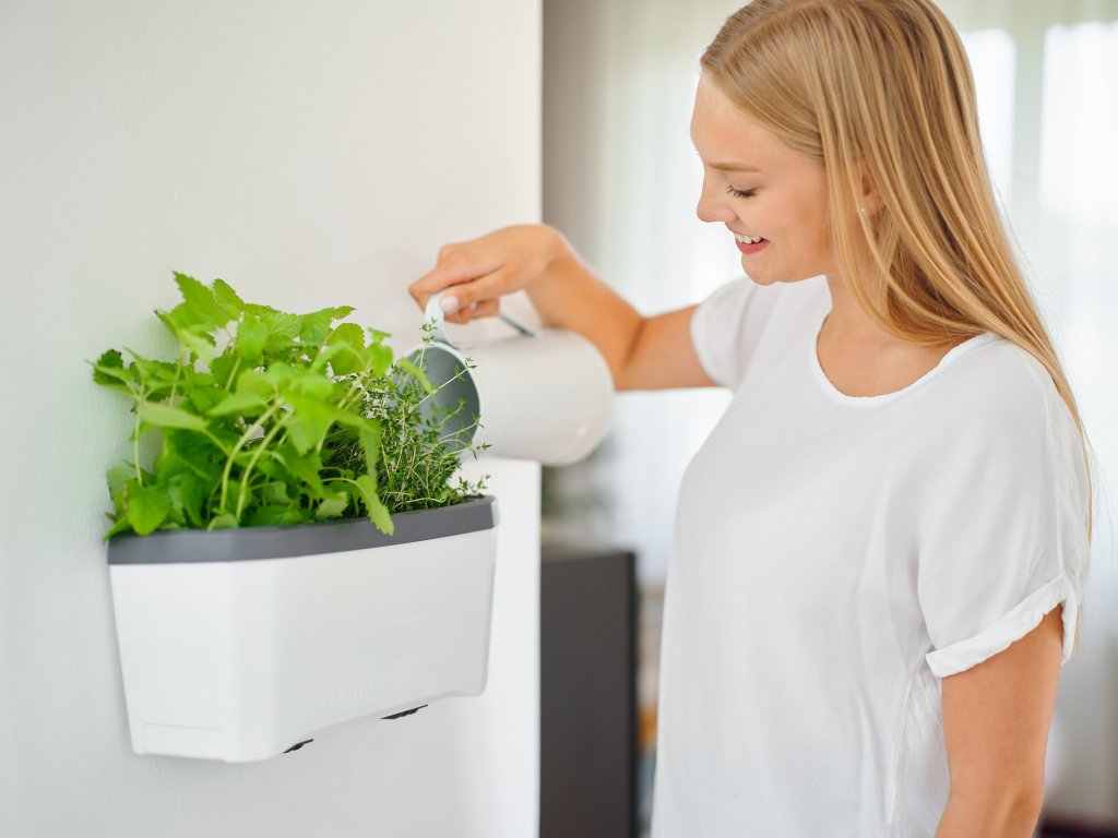- Zavlažovací systém — integrovaná nádrž na vodu so zavlažovacím knôtom zásobuje rastliny správnym množstvom vody.