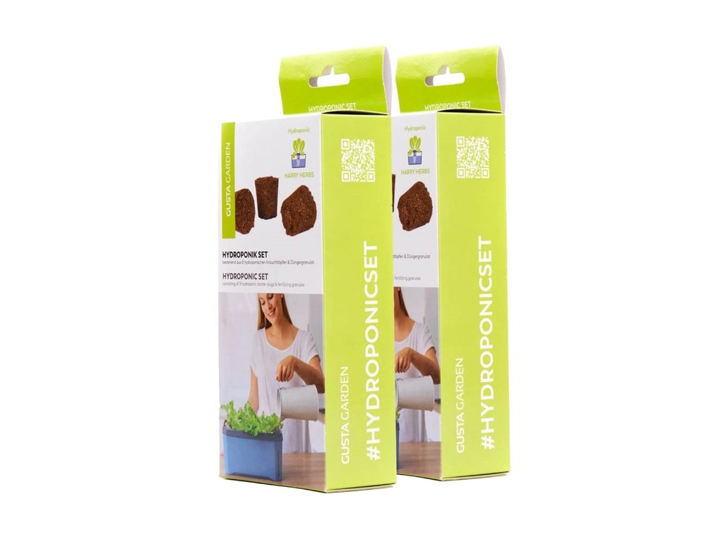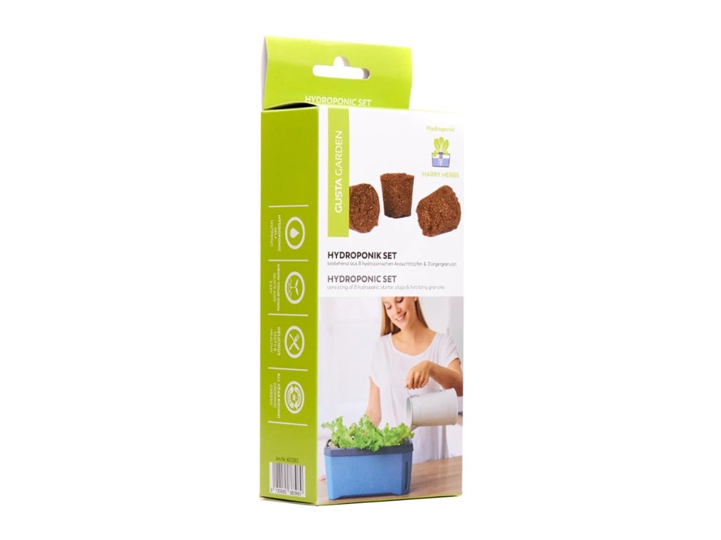 Samozavlažovacie kvetináče Harry Herbs môžete používať aj na pestovanie bez použitia substrátu. Stačí si ku nim zakúpiť set na hydroponické pestovanie. V sete sa nachádza osem hydroponických vložiek a balíček vo vode rozpustného granulovaného hnojiva, ktoré zabezpečí optimálne zásobovanie rastlín živinami.