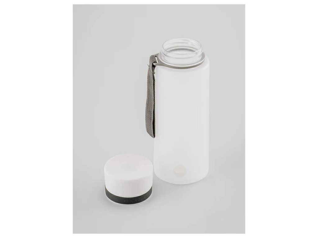 Zdravá fľaša na pitie EQUA Matte White, 600 ml na opakované používanie vyrobená z bezpečného plastu bez obsahu BPA a iných škodlivých látok. Materiál je schválený na styk s potravinami a nápojmi. Na pohľad pôsobí ako sklo, no je oveľa ľahší a odolný voči rozbitiu. Fľaša na pitie má hmotnosť len 120 g, nepridá preto do tašky zbytočnú záťaž navyše. Na uľahčenie nosenia v ruke má praktické pútko. Používať ju môžete aj na teplé nápoje až do teploty 100 °C.