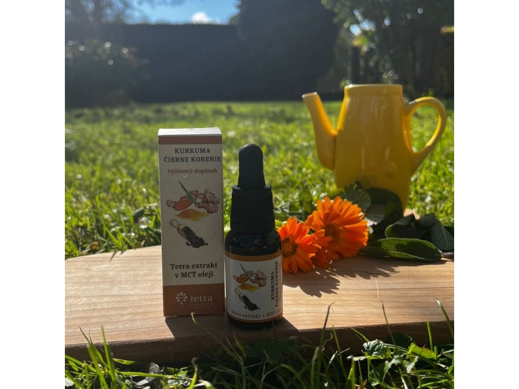 Terapeutické kvapky s tetra extraktom z koreňa kurkumy pravej (9%/1350mg) a čierneho korenia (2,5%/375mg) v MCT – C8 oleji pôsobia komplexne na celý organizmus – od tráviaceho traktu až po nervový systém: