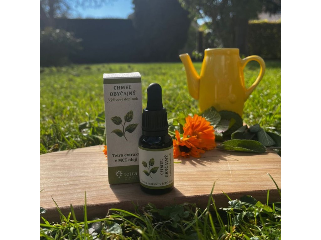 Tetra extrakt zo šišiek chmeľu obyčajného získaný šetrným spôsobom pri kontrolovanej teplote a tlaku, ktorý zachováva všetky účinné látky. Výborné vstrebávanie a účinok zabezpečuje kokosový MCT olej (C8). Terapeutické kvapky zo šišiek chmeľu obyčajného (2,5%/375mg) v MTC – C8 oleji podporia pokojný a zdravý spánok, odporúčajú sa tiež pri nervovom vypätí, počas menopauzy a na udržanie správnej hladiny cholesterolu v krvi. Chmeľ obyčajný má tiež antioxidačné, sedatívne a protizápalové vlastnosti. Jeho pravidelné užívanie prináša pocit vnútornej rovnováhy, regenerácie a podpory celkovej vitality organizmu.