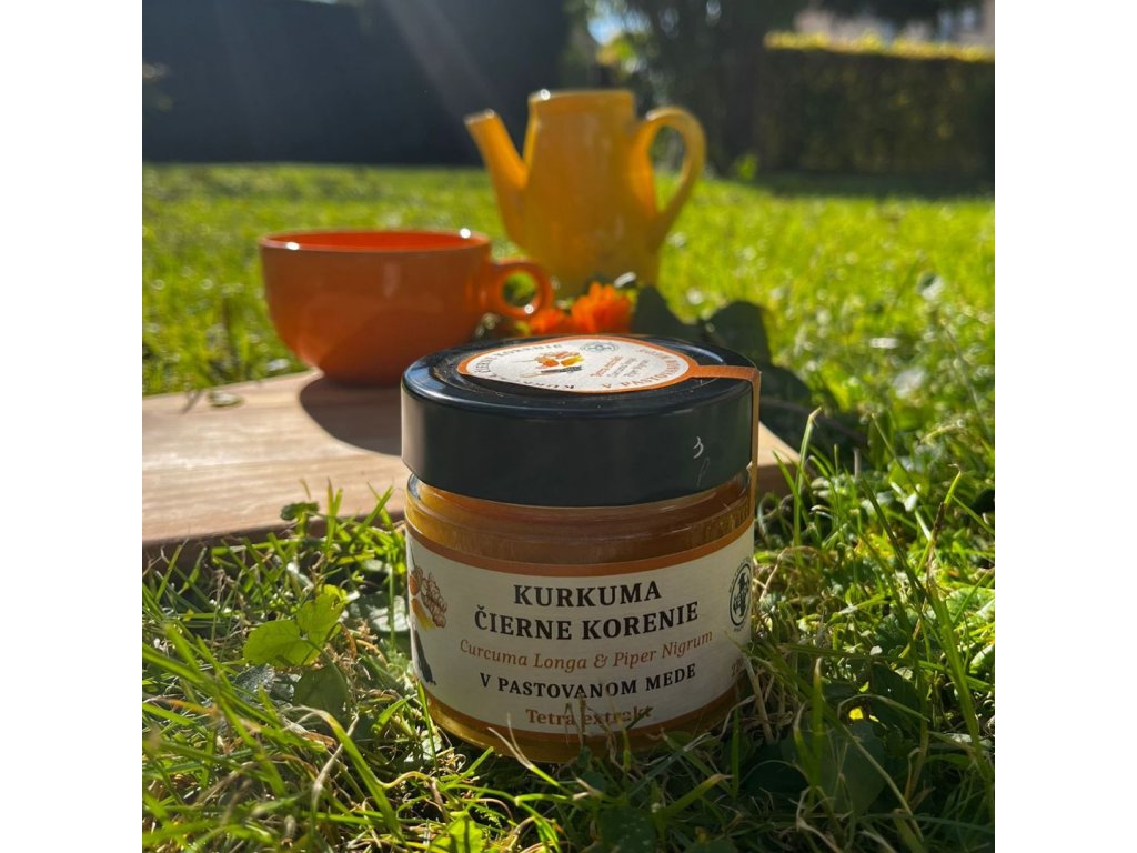 Kurkuma je považovaná za najzdravšie korenie na svete. Jej účinky na zdravie a unikátnu chuť vám prinesie v kombinácii s pastovaným medom. Pastovaný terapeutický med s tetra extraktom kurkumy a čierneho korenia obsahuje vysoko koncentrované extrakty kurkumy a čierneho korenia vyrobené metódou tetra extrakcie.