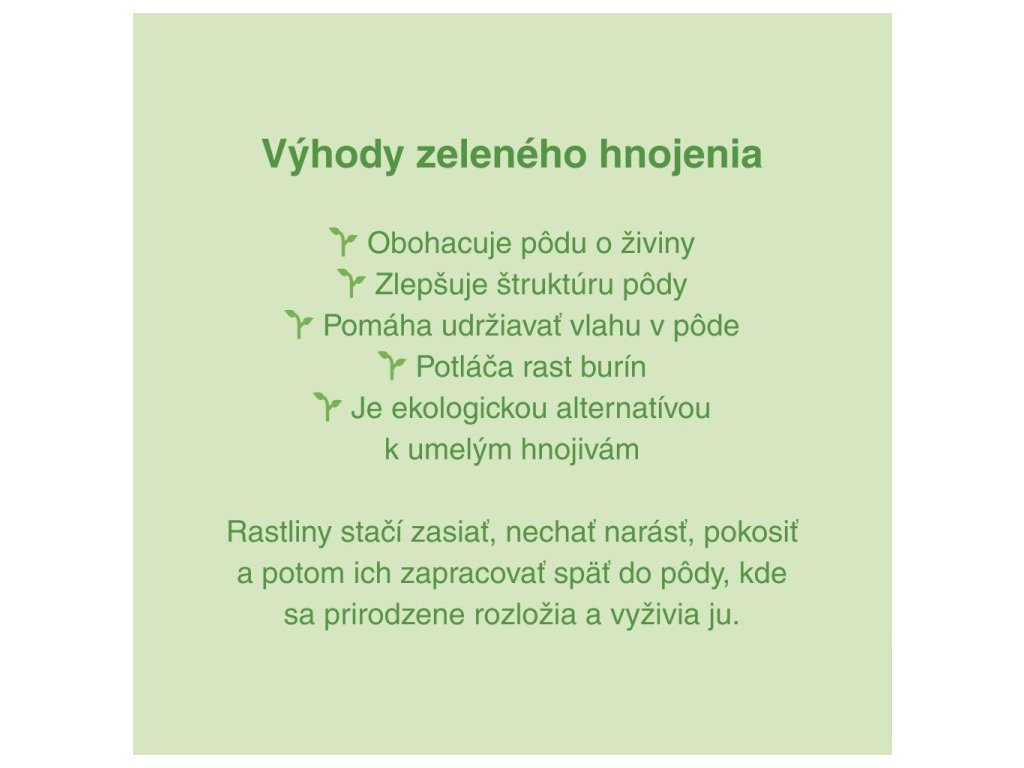 Zelené hnojenie je ekologický spôsob hnojenia záhrady, ktorý nielen dodá do pôdy základné živiny, prispieva tiež k jej odburiňovaniu. Môžete ho vysiať na nevyužívané miesta v záhrade. Prispieva k zlepšeniu štruktúry pôdy, udržiava pôdnu vlhkosť a chráni pred eróziou.