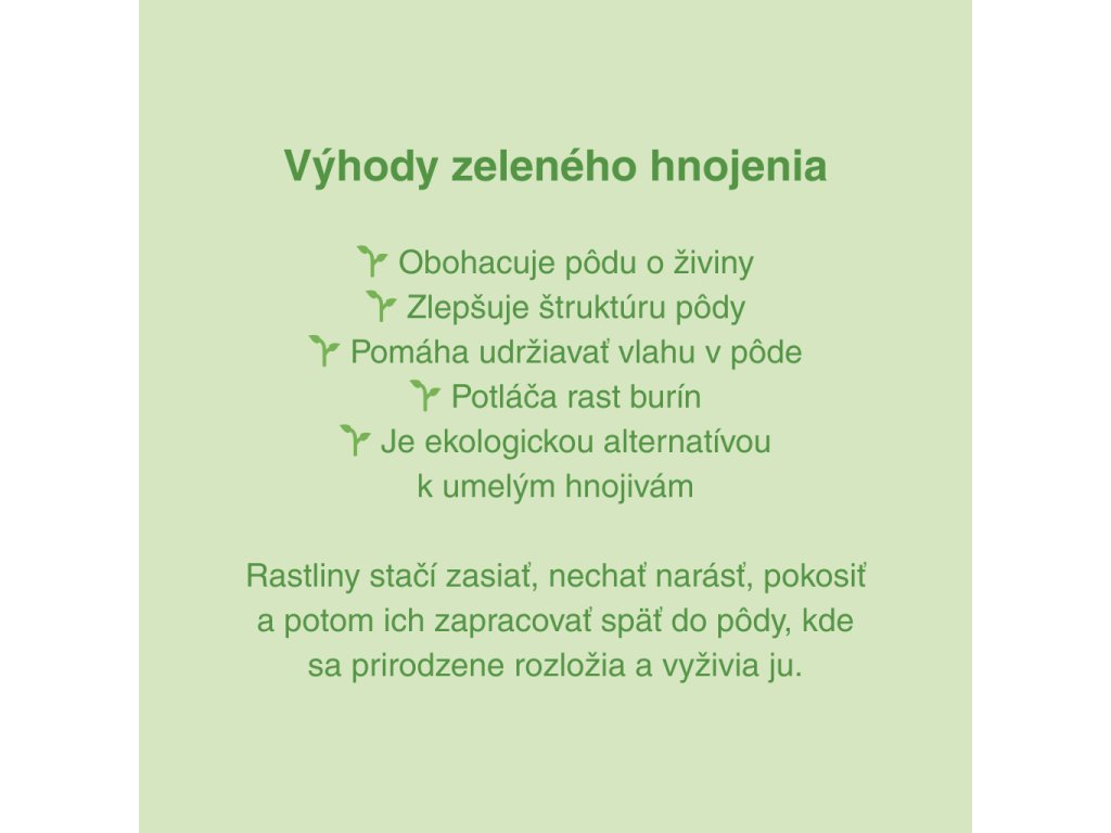 Zelené hnojenie osloví každého, kto hľadá ekologický spôsob hnojenia záhrady. Dodá do pôdy základné živiny potrebné na pestovanie plodín, prispieva k zlepšeniu jej štruktúry a chráni pred eróziou.