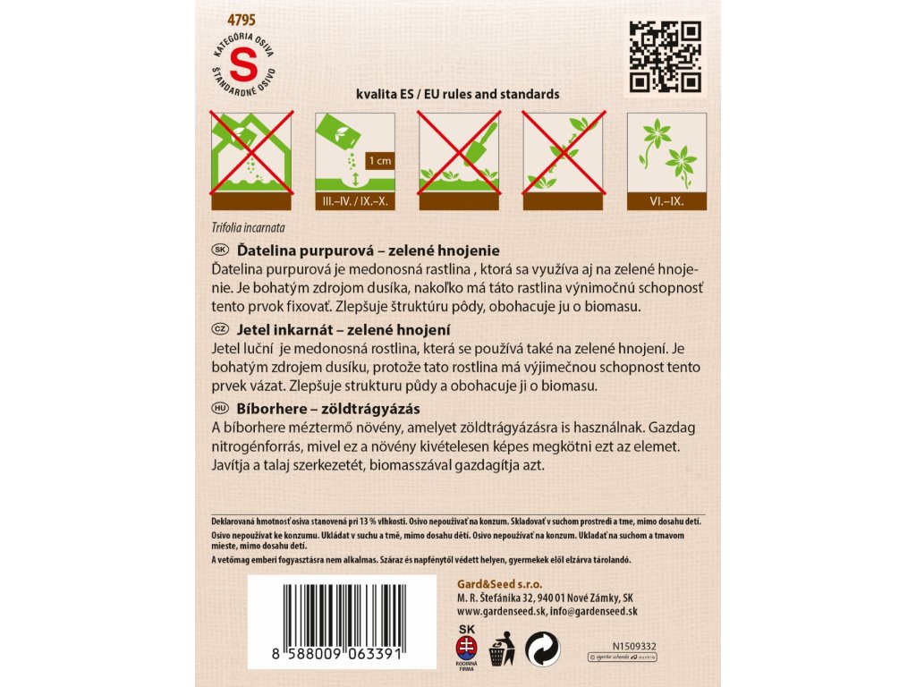 Zelené hnojenie: Ďatelina purpurová (Trifolium incarnatum) sa využíva ako predplodina alebo následná plodina, ktorá prirodzene obohacuje pôdu o dusík vďaka schopnosti viazať ho zo vzduchu. Už po približne dvoch mesiacoch od výsevu je pripravená na pokosenie a zapracovanie do pôdy. Je vhodná aj pre kyslejšie pôdy, dobre znáša vlhko a vyniká odolnosťou voči chladu. Zlepšuje štruktúru pôdy, zvyšuje úrodnosť a podporuje tvorbu organickej hmoty🌱